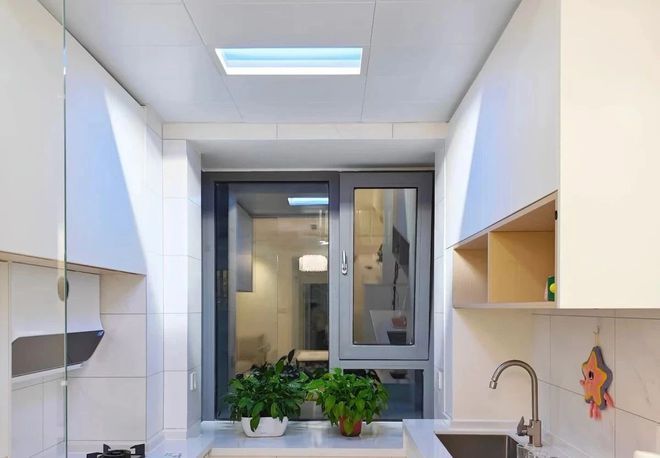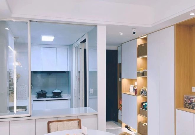 通过设置两面玻璃墙,就能轻松改变厨房的封闭状态。其中一面可以做成隐藏式玻璃门,另一面则设计成折叠窗。当使用厨房时,将玻璃门和折叠窗关闭,厨房就处于封闭状态;而当不需要使用厨房时,将其完全展开,厨房瞬间变为敞开式空间。