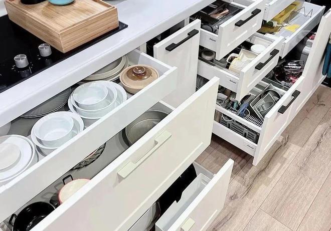 建议方案:对于厨房的地柜设计,建议大家尽量采用抽屉代替传统的柜子。这样不仅能使收纳能力大幅提升,而且几乎可以容纳厨房中所有的物品。